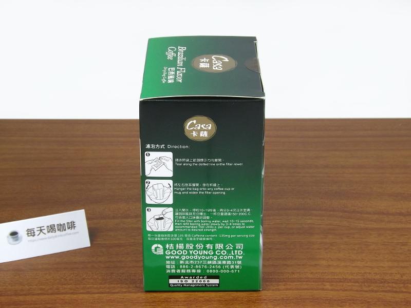 Casa 卡薩巴西風味濾掛式咖啡在大賣場與其他卡薩的精品咖啡系列擺在一起,所以我們就順手買了回來試喝看看,有別於一般的精品濾掛式咖啡,這支巴西風味的濾掛式咖啡並沒有標榜咖啡豆來自哪個莊園,我們上官方網站查了一下,原來是混合豆,有曼特寧與巴西咖啡豆調和而成的巴西風味,雖然不是頂級莊園豆,不過調合出來的巴西風味到底如何也著實令人感到好奇,喝喝看吧! Casa卡薩巴西風味濾掛式咖啡外包裝盒 中英文商品說明,原產地是巴西耶!是指咖啡豆嗎? 手沖的方式教學說明,這應該會沖的人都沒在看吧!? 一盒總共有六包巴西風味濾掛式咖啡,每包 9 公克 這巴西風味濾掛咖啡豆底喝起來如何一定要實際手沖看看才知道囉!