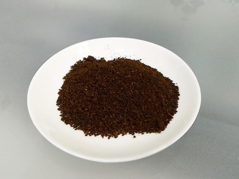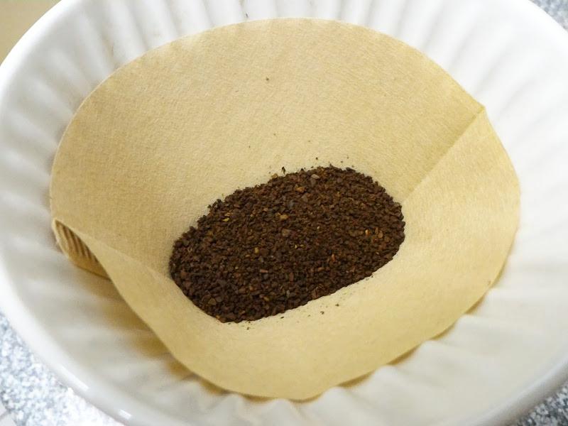 再看一下咖啡粉的粗細,真的是蠻粗的,這是我們第一次手沖的粉量,接著還有第二次手沖,有把粉量再加多一些,畢竟第一次沖這包美式咖啡粉,總是要多試幾次才能找到比較適合的比例。